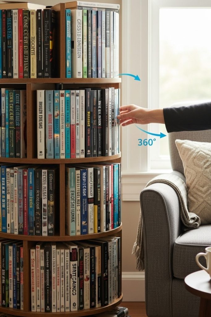 What really catches my eye is the 360-degree rotation. It means you can fit so many books into a tiny footprint and still easily reach every single one!