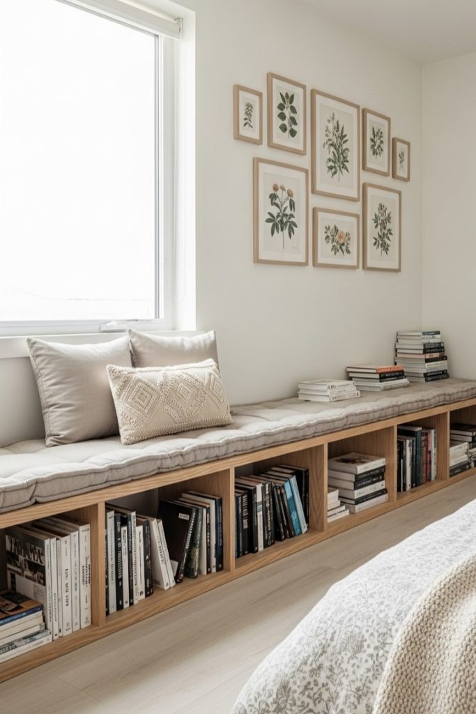 I am simply delighted by this low-profile window seat! It’s such a brilliant way to create a multi-functional space right in your bedroom.
