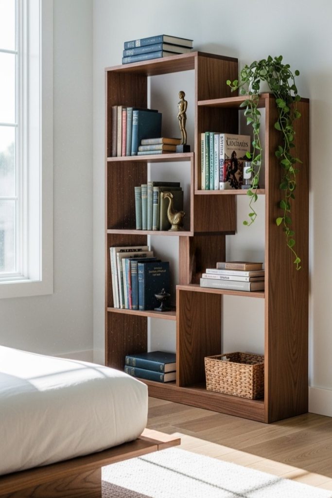 Isn’t this bedroom bookshelf just brilliant? I’m captivated by its unique stepped design. It feels so modern and fresh!
