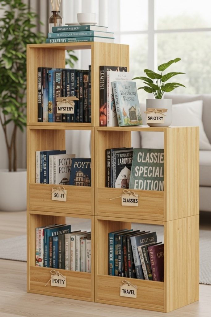 What really caught my attention are those clever drawer fronts on the lower cubes, providing hidden storage. Plus, those cute little tag labels are a brilliant touch for categorization!