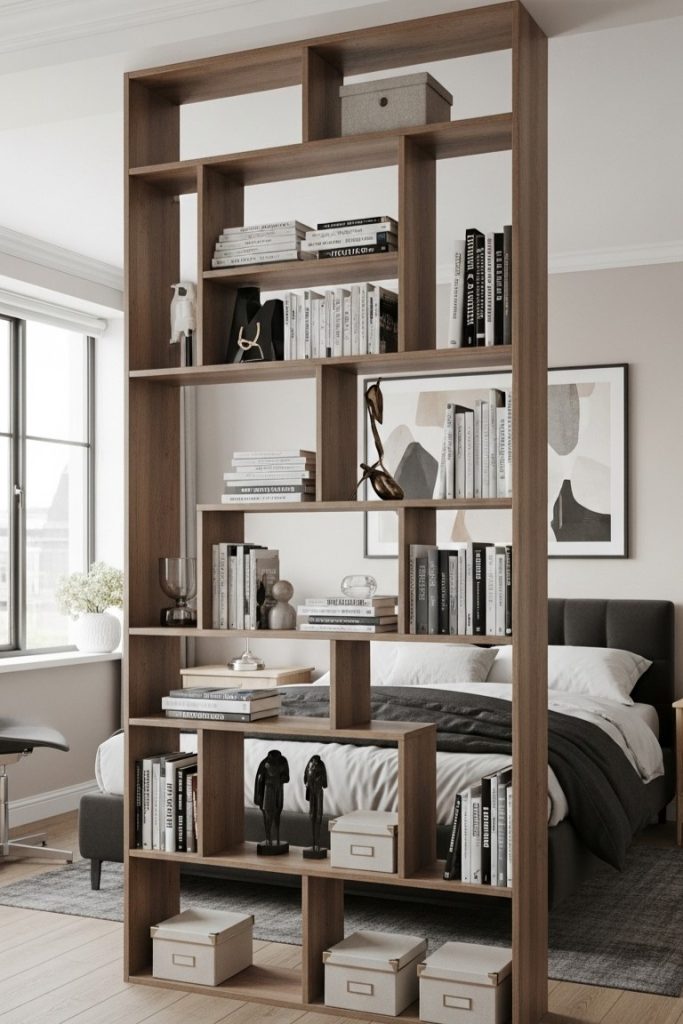 This massive room-divider bookshelf is an absolutely brilliant solution for an open-plan space or a studio! It gives you maximum display space while also defining a cozy sleeping area.