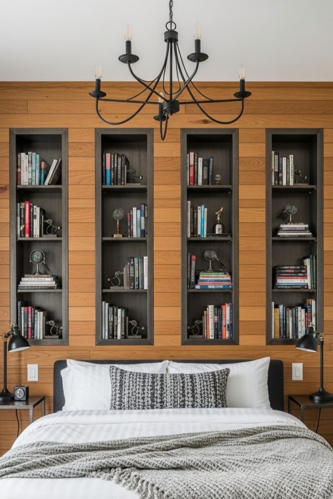 Love aesthetics? This architectural approach to bedroom shelving can do that! The use of warm wood paneling as a backdrop is fantastic.