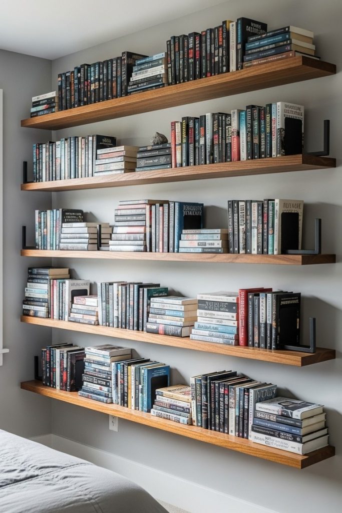 5. Warm Wood Floating Bookshelf Display