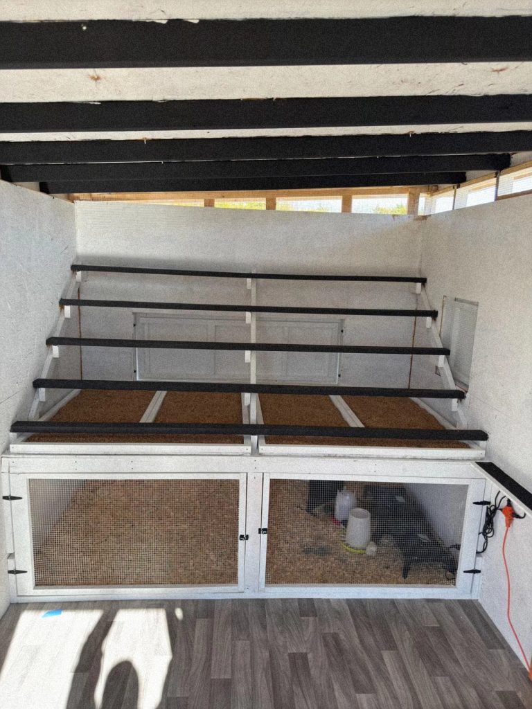 - Add the Elevated Roosting Bars: Above the brooder box, install a series of roosting bars. You can use 2x4s for the roosting bars, angled upward from the front of the brooder box to the back wall of the coop. This creates a multi-tiered system.
