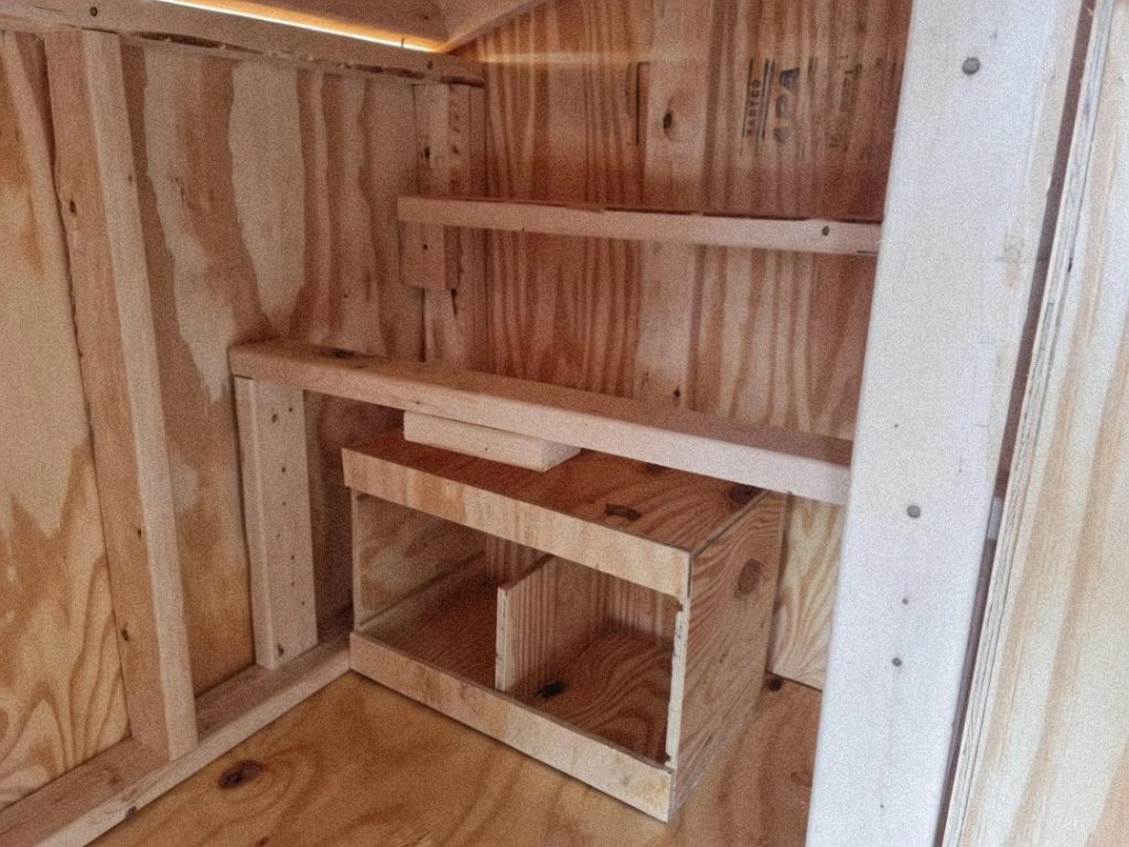 - Install the Nesting Boxes: On the opposite side of the coop, you can install nesting boxes. You can use pre-made boxes or build your own out of plywood. Secure them to the wall at a comfortable height for your hens. Having the nesting boxes separate from the main roosting area helps keep them clean and encourages hens to lay their eggs in a dedicated space.