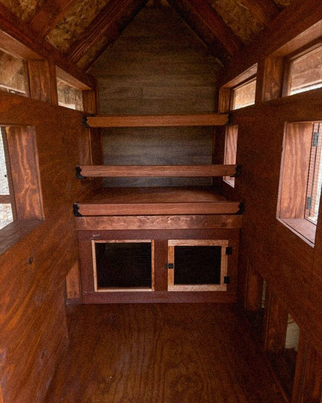 This is a highly innovative and practical design that combines a roosting area for adult chickens with an integrated and elevated brooder space for chicks. The upper tiers feature several roosting bars, providing a perfect sleeping area for the flock. Below, a secure, enclosed space with doors serves as a brooder or a separate enclosure for a broody hen. This multi-purpose structure makes efficient use of vertical space and provides a safe and clean environment for both adult birds and young chicks.