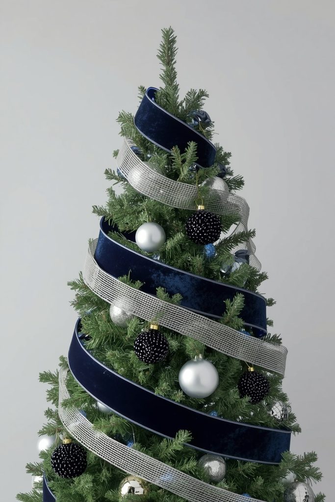 Look at how this tree uses two different ribbons for such a dynamic, modern style. The design started with a bold, thick velvet ribbon, creating a dramatic spiral foundation.