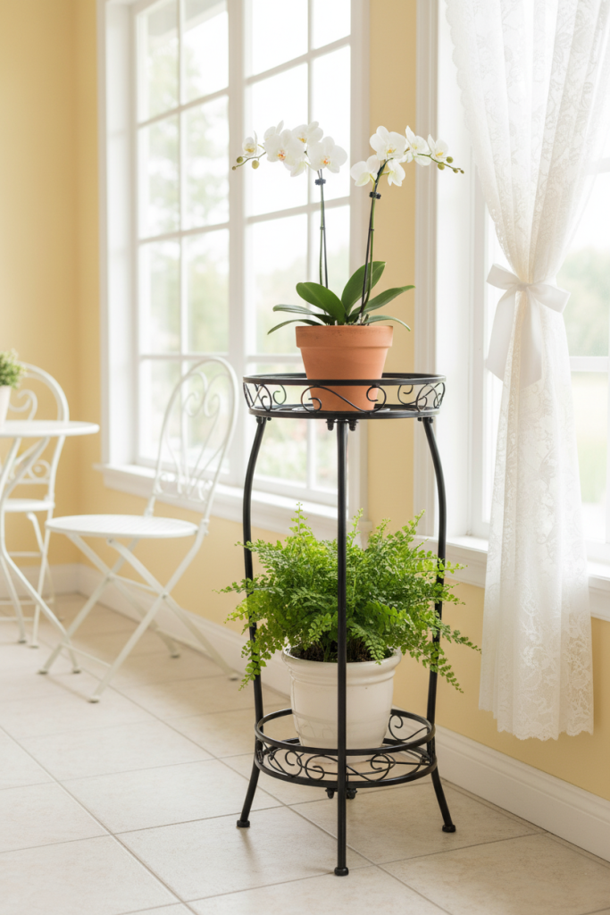 I’m often asked how to add a touch of classic charm without being overly traditional, and this stand is a beautiful answer. Its ornate scrolled ironwork and elegant, slender form evoke a timeless Victorian aesthetic, perfect for showcasing two beloved plants. It offers a graceful vertical display that can fit into surprisingly tight spaces while adding significant character.