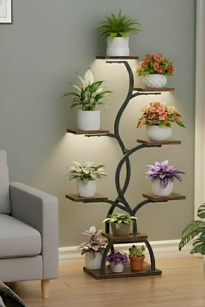 This stand’s unique, tree-like structure transforms the act of displaying plants into art. The best part? It includes integrated LED grow lights, giving you the flexibility to nurture light-loving plants even in the darker corners of your home. This design combines beautiful form with indispensable functionality for any serious plant enthusiast.